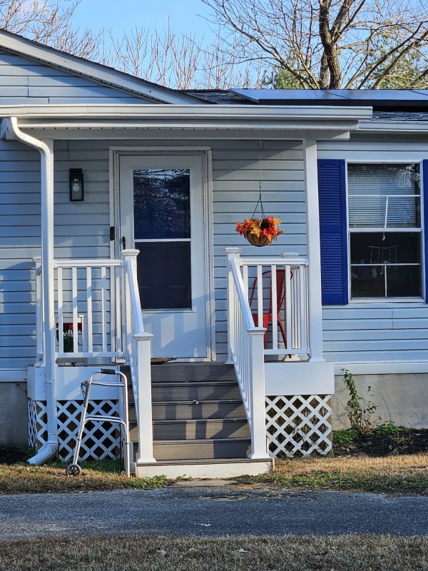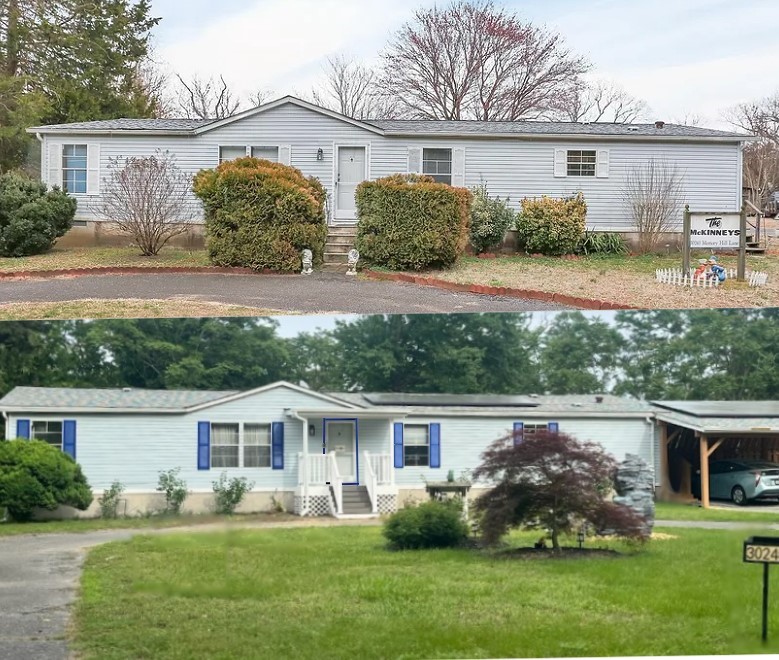 The top image is the way the house looked when we bought it. Below is how it looks now. I am hoping the mock orange and lilac bushes fill out over time to add some color to the front. We added the darker blue shutters and had the front door painted blue as well.
