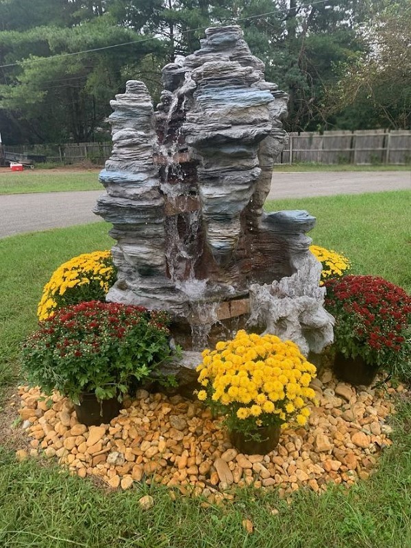 The waterfall still gives us a wonderful view from the dining room window. Fall mums really added color. And, here is Beau!